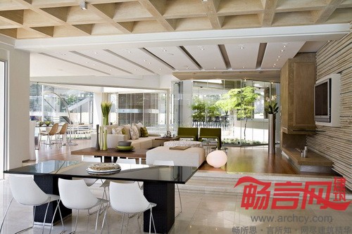 无框结构的玻璃门围绕餐厅、起居室、门廊、室内游泳馆和运动馆绵延约70米。起居室分为两个区域,与门廊、室内热水池之间形成了无障碍衔接。