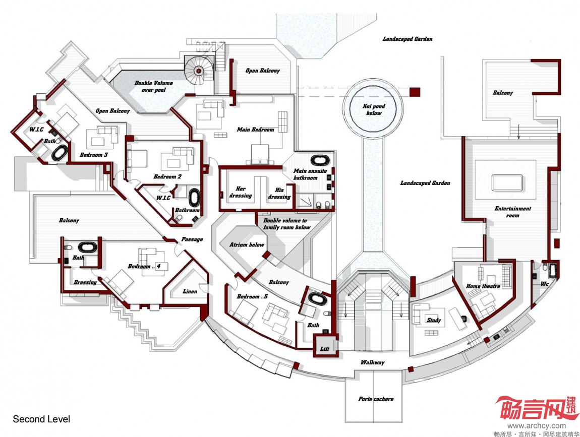 规划区域的南部是一个半圆形结构,而北部则形成一个马蹄形结构。从大门进入住宅的车道被有意抬高,以便在驶入过程中欣赏到房子和花园的景观,以及设在房子另一面的水景。