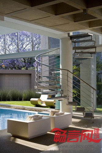 房子的入口通道是一个悬浮楼梯,由玻璃和不锈钢构成,这样就可以看到屋内的景致。另外,楼梯下面还有一个大热水池,在夏天,水池可以起到恒温作用,而在冬天,就可以和直通二楼的水循环系统一起构成一个巨大的加热设施。