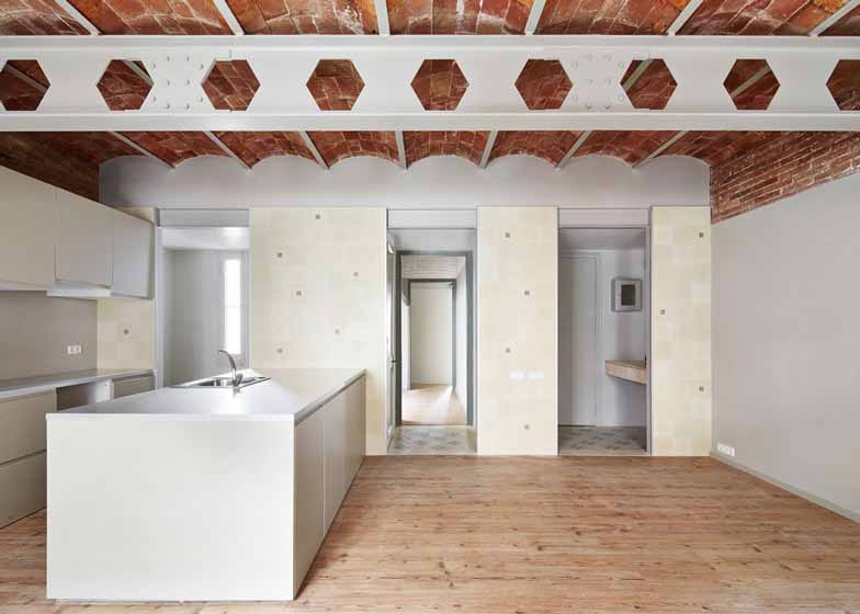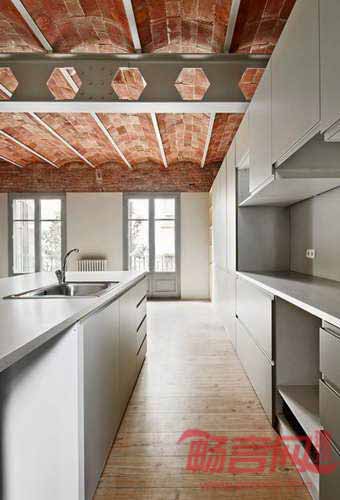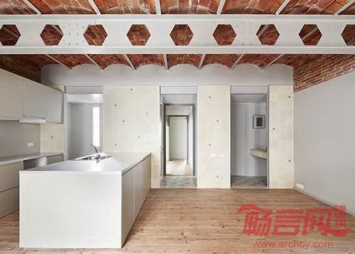 建筑实验室(Laboratory for Architecture)公司完成了巴塞罗那一套公寓改造。公寓名为Tomas寓所,具有筒形穹顶的砖块天花。设计师按照白天和夜间室内区域的使用程度进行了划分,中间由一个小房间相连。设计师透露,“在我们拆除已有石膏天花板时,发现了这层‘可爱的屋面’。”设计师有所预料,因为同时期公寓都运用了此天花板构造。设计师表示,“我们习惯称这种构造为‘加泰穹顶’,这是一种简便的建造瓷砖屋面的方式,拱顶均分了两侧的压力。”