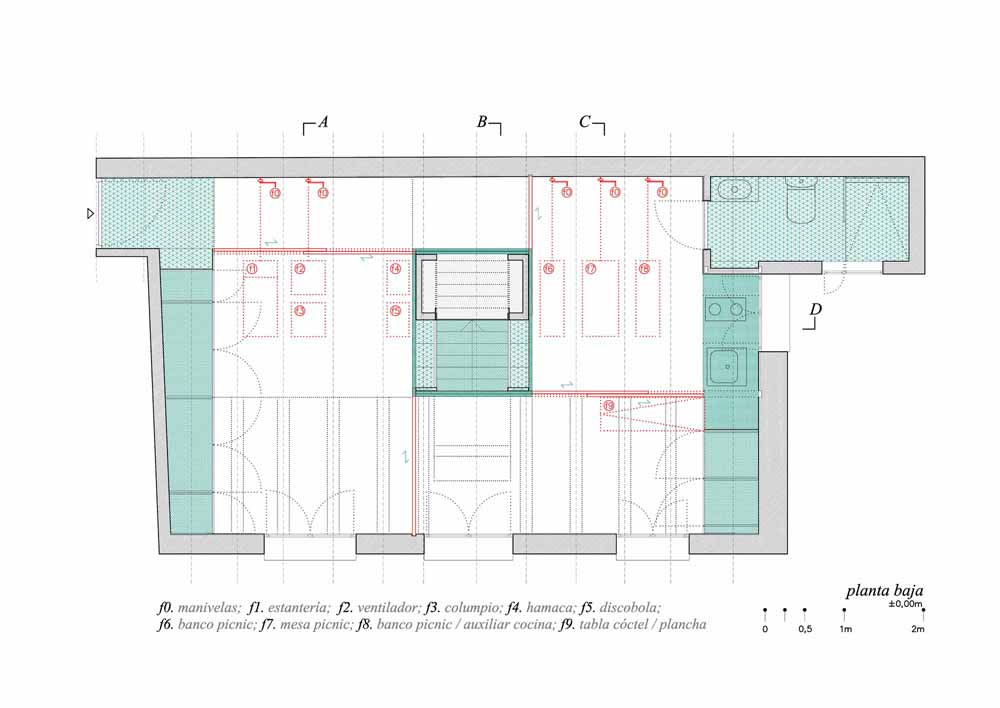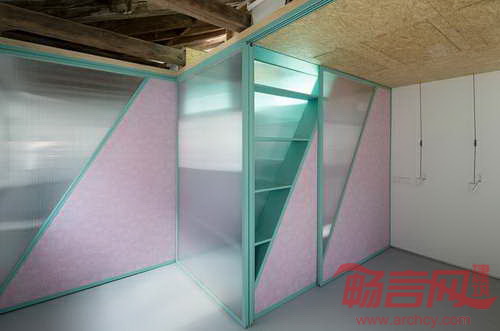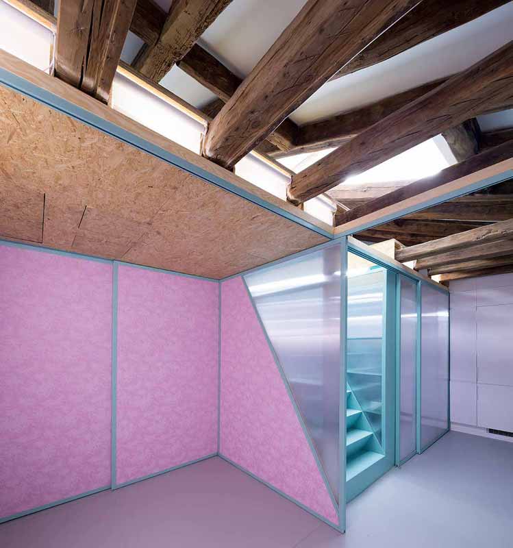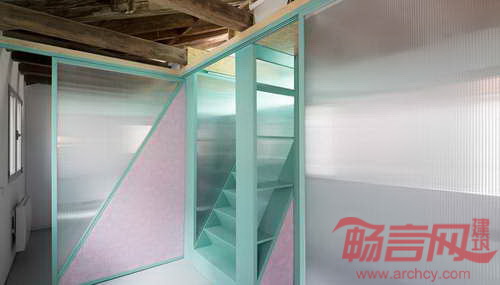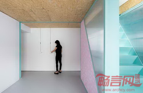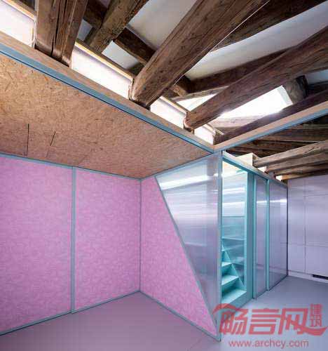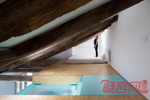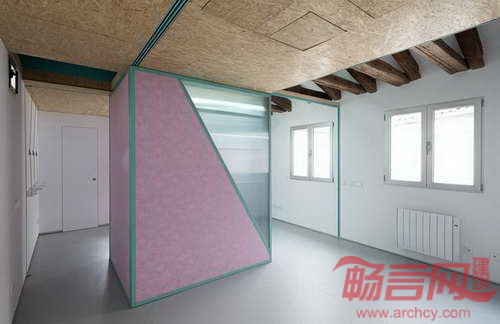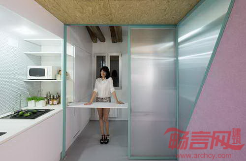 公寓位于西班牙马德里,面积为58平米。Elii建筑工作室将地面上所有障碍移除,实现了空间灵活性。设计方案有两个重心:其一,包含楼梯、置物架和储存柜的核心筒。核心筒位于中央斜面屋顶下方,使阳光从屋面洒向起居室。其二,房间功能区呈带状分布,涵盖厨房、浴室、存储区和家电区。设计师在滑轨上安装了移门,在宾客到来时,满足了灵活需要。移动门还能将厨房同起居室分开,而当门打开时,空间连成一体,提供举办聚会的条件。