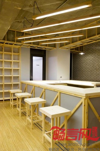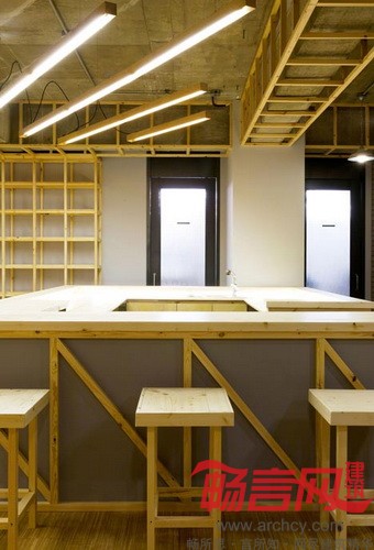 室内色彩并不绚丽,仅为灰色和黄色,比如未完全加工的松木、暴露在外的水泥和砖块等。