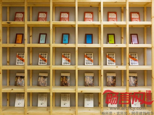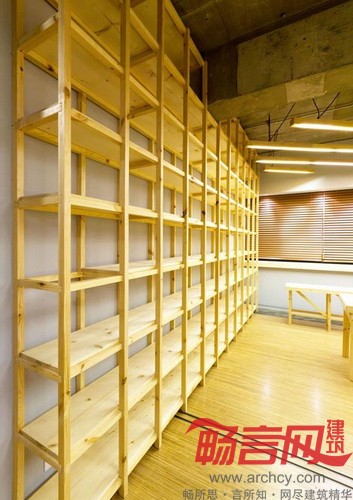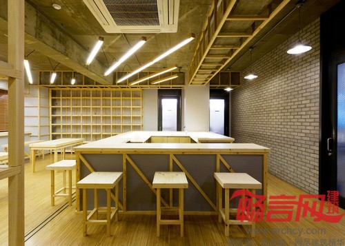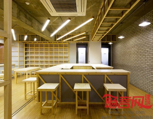 墙壁和屋顶横梁上布满了方方正正的书架,室内中间位置的吧台由长桌和凳子组成。