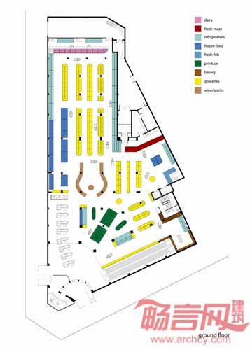 Thanopoulos超市位于雅典北郊,是一个家族经营的产业,在该地区拥有其他两所连锁超市。这家定位高端消费人群的超市供应在其他城市超市中不常见的进口物品。经济危机期间,超市经历了人均消费额的下跌。店主抓住经济回升机遇,重新规划店铺,并定义经营哲学和超市形象。项目改造期间,超市正常营业。超市周六晚间9点后停止营业,大部分工程在周日进行。设计公司任务艰巨,三层空间在改造前显得破败无序。多年内,超市经历了多次空间扩充,内部形成迷宫般的通道,各层流通空间混乱不堪。改造后,二层空间预留给未来的咖啡馆。流通空间得到合理改造,添加了两个自动通道,并对货架进行重整。