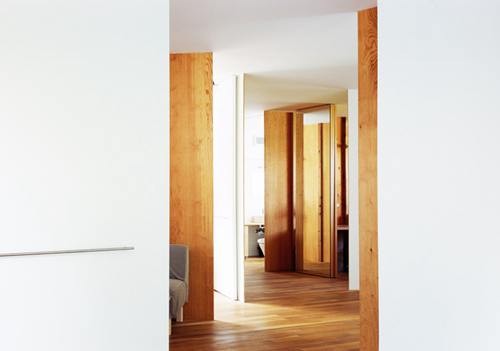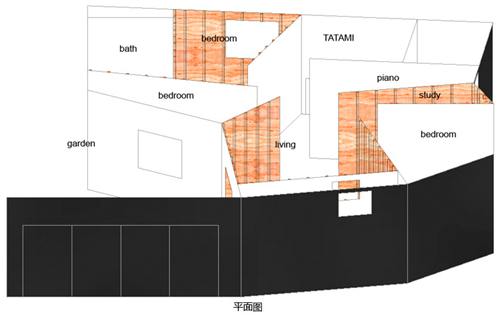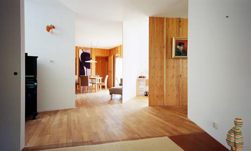 内部空间是一个以放射状配置的墙面缓缓区隔出来的连续性单一空间,而这些12mm的薄木合板墙与45mm的角柱,是整个房子的主要结构;墙的一面涂成白的,另一面则是裸露的柱面,并以木材原有的肌理外露。这些墙的配置角度看似随机,但其实是经过大量的计算研究后决定出来的,为的是不要让各个空间直接暴露于视线之中。透过不限定各个房间的机能所存在的暧昧性格,使得每一次在室内走动时映入眼里的房间之间的关系都有所改变。在其中,经由视点的改变,可以发现空间的各个角落看起来很近但其实很远、似乎开放却又狭窄、看似分离但却又相连在一起,个别的居住领域因而带有微妙的关系性。借由距离感的塑造而使得住宅内部空间产生无限的变化。