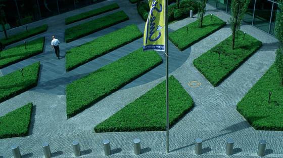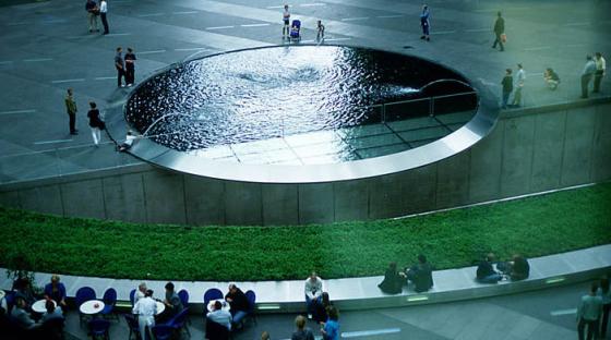 中心广场是环境中最精彩的区域,这里,彼得•沃克(Peter Walker)采用了重复构图形式的三维空间概念。 建筑的首层和地下层之间是一个半月形花坛, 与半月形图案相交的,是一个圆形的水池,水池大部分位于广场上,一部分悬在地下采光窗上,成为建筑地下层透明的屋檐。在楼下电影媒体中心的酒吧里可以欣赏到水池带来的奇妙的光影变化。
