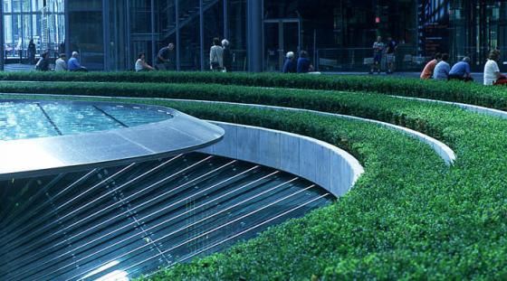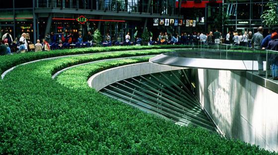 索尼中心的精华在于其公共空间的丰富多彩和人性化的尺度与亲切的气氛。中心丰富的室内外空间转化和神秘的景观变化是景观设计师彼得•沃克(Peter Walker)用简单的植物种植和一些工业材料如不锈钢和玻璃以简单、重复的形式来塑造的。在这里,人们在转换空间时就能看到不同的景观。环境中材料的使用与建筑相呼应,细部体现为玻璃、金属材料、石材和植物的巧妙组合和衔接,在不同的区域种植了不同的植物,如椴树、白桦、杨树等,这些都是当地的乡土树种。