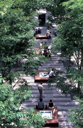 3、通过单一的大乔木创造出了大的优美的植物景观。广场中原有一个神社,它被保留了下来,彼得通过将神社中的树木引入广场中,即保证了广场整体元素的统一,又有效地实现了新旧的、不同元素之间的过渡。同时彼得重复的大量的栽植这种树木,最后创造了一个城市中的“森林”,有效地把广场与周围高大建筑实现分离,形成了一个小的广场的自己的空间。