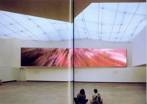 建筑呈矩形展开,与展厅曲线型的屋顶形成了强烈的对比。曲线型屋顶由一个立体框架承托,像自然丘陵,起伏蜿蜒,上面覆盖着半透明的薄膜,使白天透进来的自然光变得柔和,而夜晚内部的灯光使整个建筑更加璀璨。