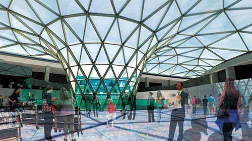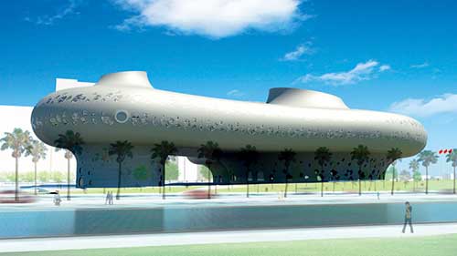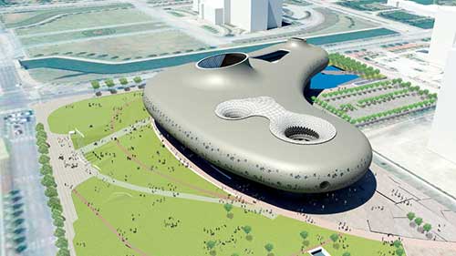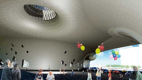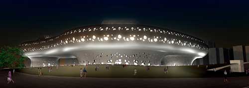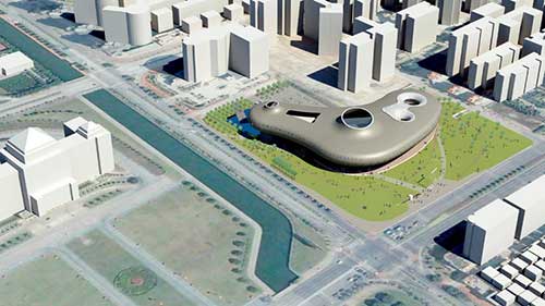 该建筑是一座综合3种功能的文化综合体:一个可容纳500人的剧场,一个数字影院、一个大型的展览空间及青年宫。进入每个大空间的主要通道都在地下,且靠近地铁站。在总平面布局上,3个主要的功能块文化中心、会议室及展览空间布置在南侧,面对迎宾大道的南立面是建筑的主立面,青年宫布置在北侧,与文化中心一起形成建筑的另一个主要体量,西侧毗邻花都区区政府。在剖面中,主要空间被安排在建筑的主要楼层上(3~4层)。这种分区方式使得每个部分都有自己独立的出入口。主要使用空间下面是开放的公共空间。连续开放的空间体量成为城市新的象征。
