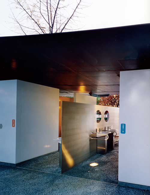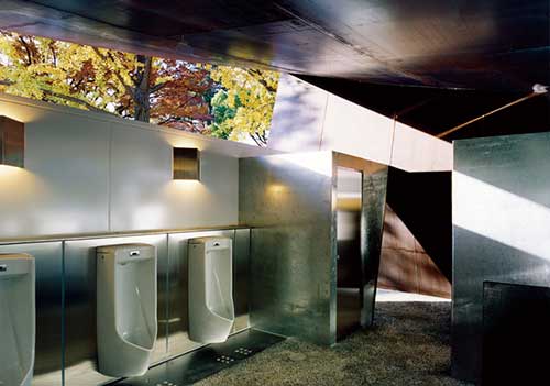 该项目所用材料是防腐蚀钢板。桁架结构是用25mm厚的钢板制作的,位于建筑左右两端。悬臂曲线由16mm厚的钢板制作,跨度达到20m,厕所的蹲位就位于这个大空间下方。建筑的左右山墙承载着屋面,相互倾斜。施工过程中,它们在重力的作用下发生了变形和扭曲,之后还经历了整修。