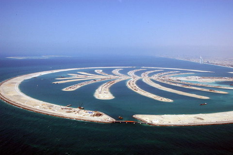 阿联酋棕榈岛包括一条主干、十六条枝叶以及外沿圆环防波岛。岛宽约6公里,深入阿拉伯湾5.5公里。岛上建筑由各式别墅、公寓和公共生活娱乐休闲区组成,建成后将成为世界上独一无二的功能完备、景色醉人的居住、旅游、休闲胜地,被誉为世界第八大奇迹。