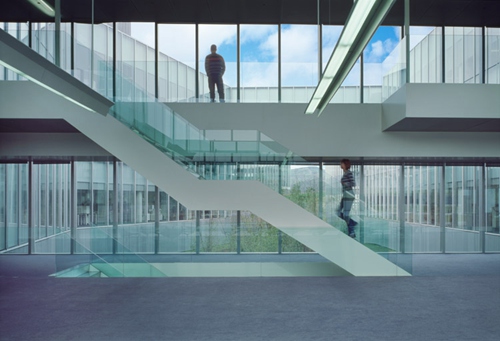 办公大楼所面临的问题大多是如何建立工作站与户外环境之间的视觉联系。在本案例中,歌美飒建筑主要用于科研,位于潘普洛纳市郊,四周群山环抱,绿树成荫。大楼与其他建筑体从新的开发区之一中拔地而起。开发区有一个新颖别致的名字,设计参照新技术,“闭关锁国”、缺乏与户外的互动是区域内建筑的一大特色。项目目标是保证建筑(室内用户)“知晓”自身赖以生存的特定“场所”,并将其中的奇妙景象化为己用。为此,项目方案并不仅仅将场地视为体块栖息地,或建筑周边环境的一部分。恰恰相反,设计将景观融入建筑内部,而建筑也自然开放。在建筑内部,景观创造了空间和视觉复杂性,模糊且强化了室内外的界限,开启了彼此间丰富的对话。项目的大型功能区区依据不同的功用进行划分。户外空间的周边设置封闭的办公室。室内空间融入巨大的带花园的中央空间,赋予了建筑以一个开放式办公室空间特性。