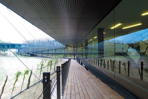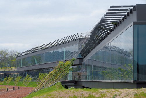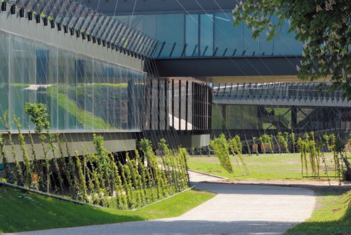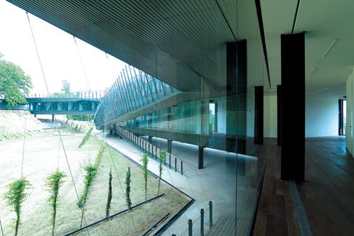 一系列的斜坡和平台处理将内部空间延伸出去,并能遮盖全玻璃覆盖的建筑立面。建筑屋顶通过吊桥与城市相连,这里是俯瞰滨河公园的公共散步场所。绿荫在这个透明的建筑周围,为其创造了良好的小气候条件,建筑就像一个葡萄架下的玻璃盒子。