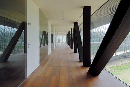 设计将周围的大地景观纳入建筑的内部空间。线性结构在最大程度上扩大了建筑与外界的联系并满足了建筑的教育功能。建筑多由沿走廊布置的教室和办公室组成,这些使用空间贯穿于整座建筑,蜿蜒曲折中与建筑周边地形相协调,同时也成为每一个研究中心的辨识点。走廊包含建筑的公共空间,其一端通向外面的花园,在另一端则可眺望河流景观和三个农场。
