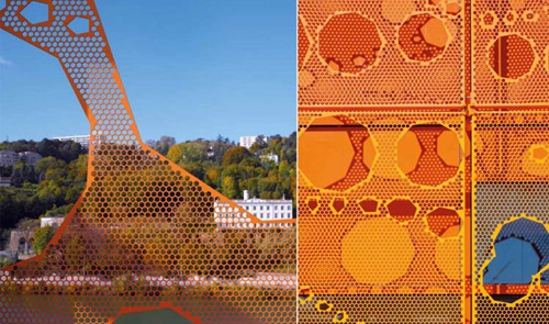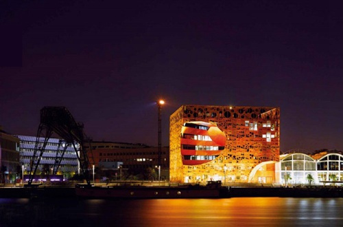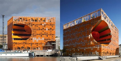 这个立方体建筑与现有的萨兰大楼相邻,更加强化了它的自主性。它是基于29m*33m的钢筋混凝土柱网设计。轻质的表皮,看似随意的开口,不规则的穿孔图案反映着河流的变化。橙色表示铅涂料,是港口区常用的工业颜色。