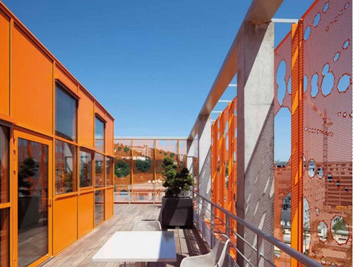 建筑与海港相邻,橙色的金属网格外表皮上布满大小不一的孔洞。整个体块被一大一小的挖空而打断,一处为一层的入口,大的挖空位于上层的一角,形成了一个中庭空间,也将内部的楼层和阳台也向外开放。