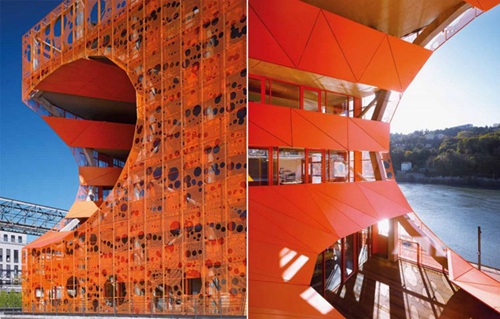 橙立方(the orange cube)位于法国里昂,由来自巴黎的工作室Jakob + Macfarlane设计。这栋六层的大楼分为两部分,建筑底层为双层楼高的展示空间,上层都为办公室,第六层为屋顶平台花园。在展示区,穿插了许多带多边形孔的全高展示墙,墙内摆满了各种展品。