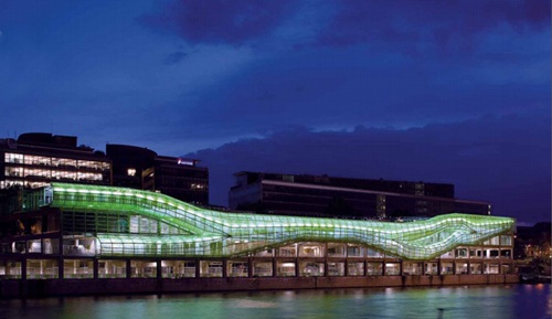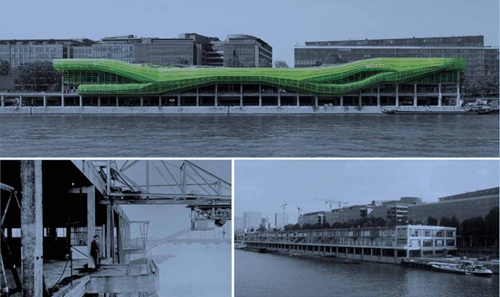项目周围的办公楼创造了一个非常枯燥而又中性化的城市文脉。这样的环境有利于设计一些不寻常的、具有幽默感的建筑。在码头项目的设计过程中,设计者感到被动地等待城市环境的变化是毫无意义的,在项目基地所处的商业区和工业区更是如此。码头区域的现状是一些尺度巨大的仓储用房,从未建设过人性化尺度的建筑。现有的设施包括轮船、起重机、仓库、卡车等。这些设施已经形成了当地的地貌,整个区域完全没有亲人尺度的设施。工业区内还分布着建于20世纪60年代至70年代的办公楼,所有的这一切都要突然与巴黎城区联系在一起。不仅仅是修建办公场所,还包括公寓、教育设施、休闲场所、公园、体育场等……原先的工业厂房已经被改建成了拥有25 000名学生的新大学。设计者认为这样的变化与巴黎市区的扩张密切相关,大巴黎已经延伸到郊区,不再受到环城带状道路的限制。