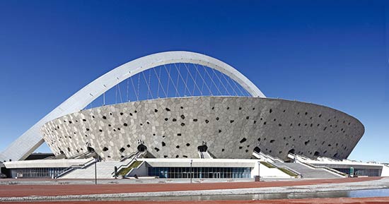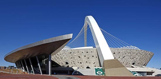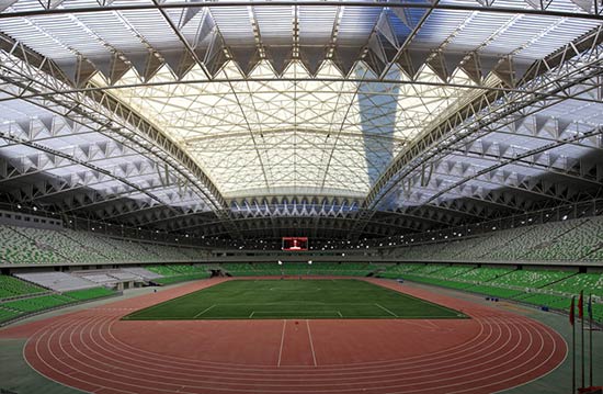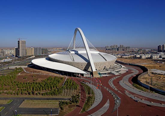 鄂尔多斯东胜全民健身活动中心位于鄂尔多斯市东胜区北部,占地49.3ha,其中包括体育场、综合体育馆、体育商业中心、水上运动中心。建筑设计中通过“弯弓”、“哈达”等蒙古族元素来塑造一个有当地文化特色的体育中心。其中,拥有“弯弓”造型的东胜体育场总建筑面积达100 000m2,设有35 000 席固定看台,5 000 席活动看台,体育建筑甲级标准,并拥有国内领先的10 000 m2 开合屋盖。其建造标准也居国内翘楚,采用了多项国际领先的新技术、新材料,总投资约16 亿人民币。
