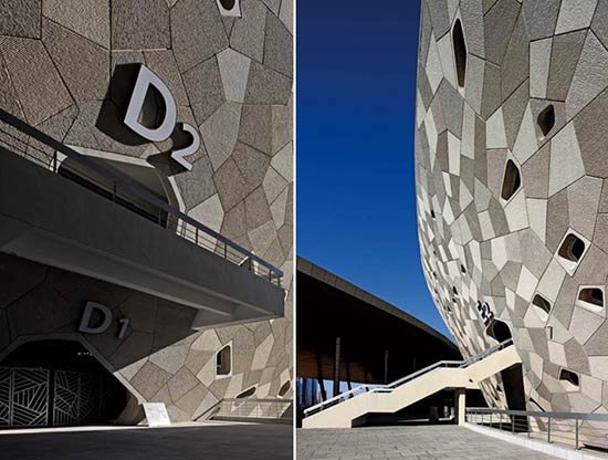为了避免超大尺度形体给人带来的压抑感与乏味感,主设计师决定在立面上采用冰裂纹的处理,主持设计中国内蒙古“鄂尔多斯全民健身中心”工程的中国建筑设计院总建筑师崔愷选择了由北京宝贵石艺科技有限公司研究生产的再造石装饰混凝土轻型墙板,总面积近26 000m2。两万多平米由标准板、洞口板、异型板等多种板型组成,每块板大约1 600×3 700mm,北京宝贵石艺科技有限公司在模具研制、产品工艺、表面效果处理等方面不断创新,“一道工序成阴模技术”和“废石利用技术”是该公司的国家发明专利,在此项目中发挥了重要作用。