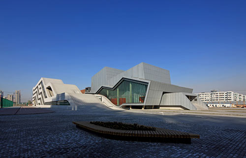 新的图书馆、少年宫外立面运用了多种材料:石材、复合生态板、铝型材、预嵌玻璃砖混凝土挂板等,各种材料特征被高度协调在一个语境下,加强了之间的整体性与交融感。同时它们又彼此独立,根据其各自不同的功能,图书馆集中式大空间少年宫多为单元式小空间,结合中央公共广场产生了不同的形式特征。对于少年宫来说,内部C型院落与中心公共广场组成了一个环形交流空间,并且在环形的空间界面上通过不同高度、不同色彩、不同体块的造型进行视线引导,产生出适合儿童嬉戏游玩的各个平台。而中心广场作为一个虚空间正好能衬托出图书馆的体积感,站在中心广场之上迎面而来的是图书馆西侧主立面不同角度的石材缓坡,它们以一种热情开放的姿态呈现着,向城市传递着强烈的场域公共性。