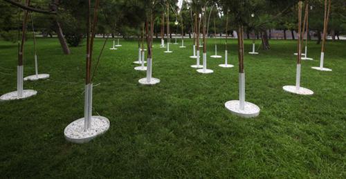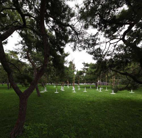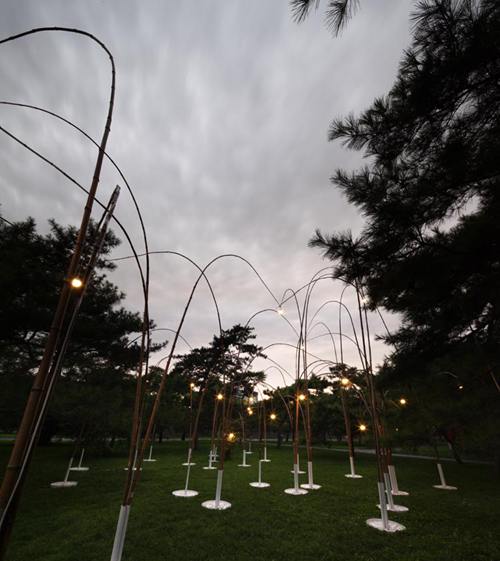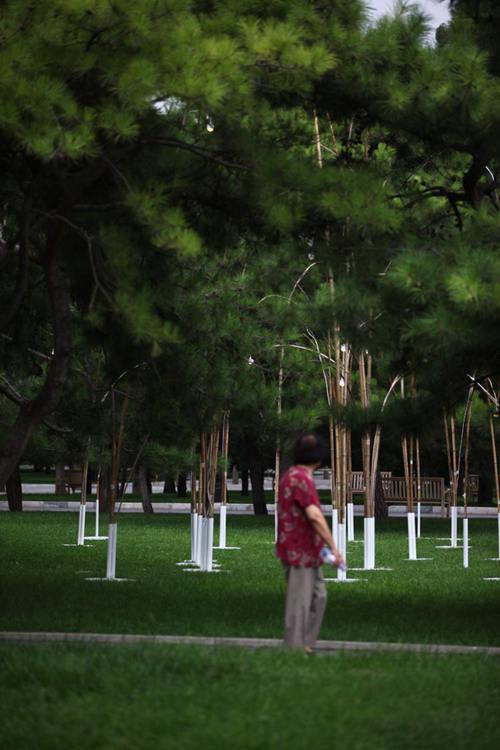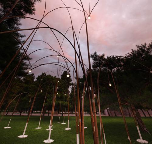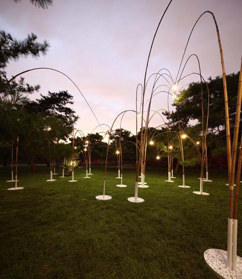 装置形态利用竹子模拟拱顶结构,从每个多边形基底延伸起拱融合于中心点,并将间歇闪亮的暖光灯置于中心点,以营造出一种平静自在的氛围。为呼应场地周围草地和树木形成的良好自然环境,整个竹林的体量沿人行道向草地内部逐渐升高,游人进入竹林的同时,也自然同空间形成一种互动。作品旨在引起人们对快节奏生活的反思,希望能让步入竹林空间的观者,在被充满向上张力的竹子吸引时,能停下脚步,抬头看一看天,感受自然的美好。