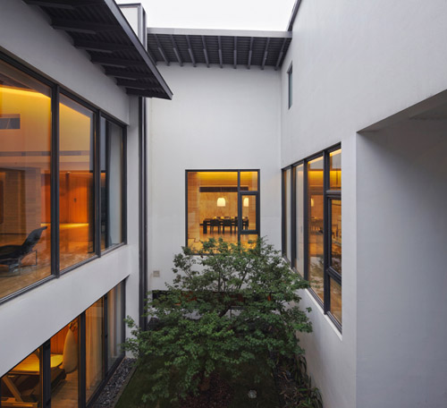 “分”、“院”、“园”。 分:化整为零,将建筑内各功能进行拆分重组,使一个建筑更像若干个建筑的集合;由此,可以使更多的房间前后通透,得到良好的通风、采光质量,适应当地阴湿多雨的气候, 同时与室外空间与景观更紧密地咬合。院:拆分重组后的房与房之间,形成多个不同尺度的围合、半围合院,提供给住户可居的室外空间;园:从路到水的景观系列引人进入休闲生活的状态,也呼应了传统江南园林的体验;至此,每个别墅既是一个房,还是一个微缩的园;对它的使用既是住,也是游。形态上,山墙加坡屋顶再次运用江南民居的建筑元素,而非传统材料做法—灰色石材、铝合金门窗和屋面、金属压顶—等的运用,又是对其的重新诠释。