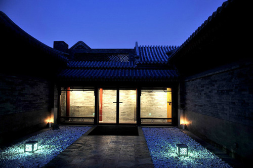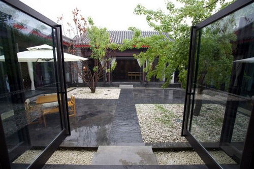 此项目的现有建筑是一组新四合院,为了保持两个院子的感觉,将需要封闭的院子做得通透、明亮,用一个悬挂的八面屏营造既开敞又亲密的尺度。其结果形成一个室外一个室内的两个院子空间的对比,其它空间都围绕院子展开。我们采用了传统材料当代做法的策略,用非常规的使用和建造方法来组织木、砖、瓦等典型材料,达到传统和现代的共生与结合。我们对传统园林是抱批判态度的。我们的景观设计中把传统庭院内繁琐的设计元素简化成几个色块和质感。