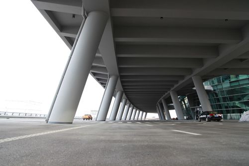 透过纷繁的脚手架及钢杆件,我们可以感受到由24组V型柱支撑的由空心梁放射排成的108米“太阳轮”的巨大,可以看到航站楼草原雄鹰般的姿态与气势。可以想像,面对内蒙古戈壁严酷的气候,无论在烈日骄阳还是狂风暴雪中,建筑师们安排的乘客是如何畅通无阻地从停车场到航站楼再登上飞往各地的飞机。