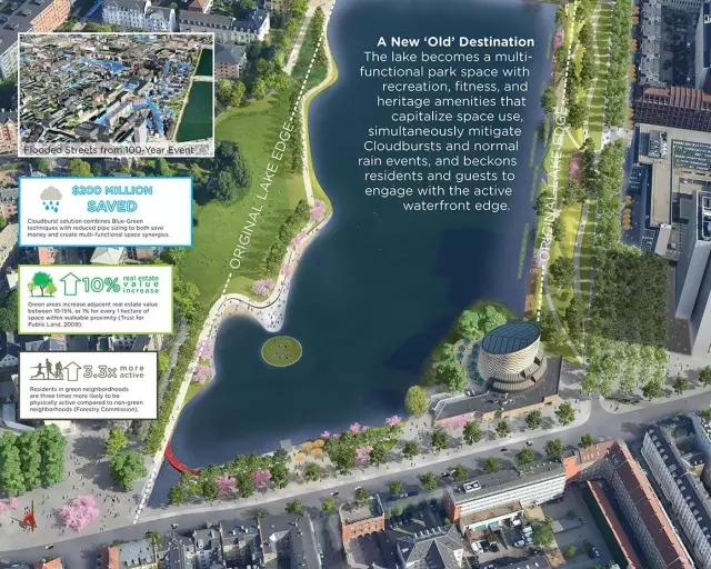 传统主体规划方案保留Sankt Jørgens湖,继续存在;其具有文化价值,要保持其历史布局,然而该湖位于周围街道水平上,在雨季会发生洪涝,需要建造一个新的、5米为直径的管道,以漏斗形式将洪水排放到港口。技术工程的投资需要花费蓝绿管道建设的两倍,同时新公共绿地也有限。