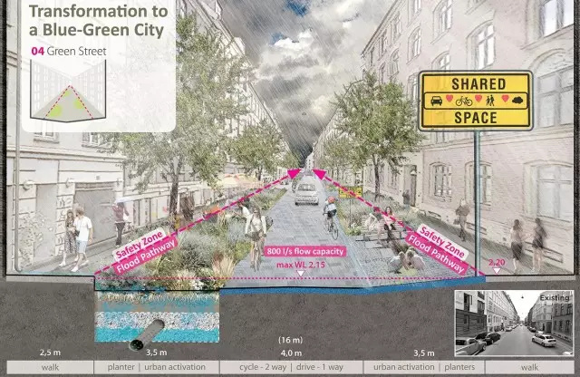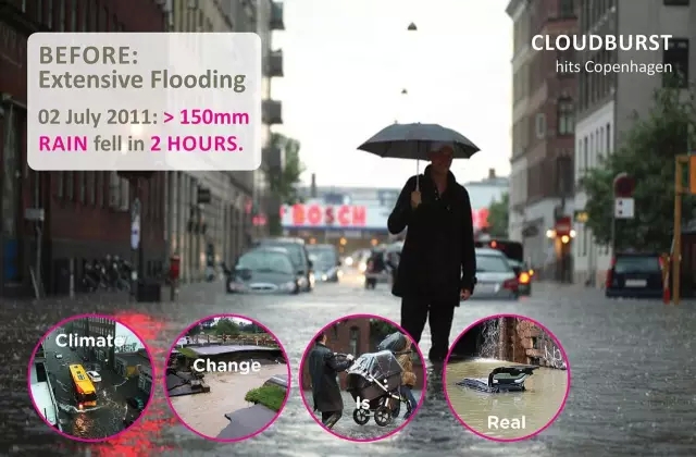 2011年7月2日,在不到两个小时内,哥本哈根遭受了1000年一遇的极端风暴天气——或大暴雨——城市中大部分地区达到150毫米的降雨量,积水达到1米的高度。2011事件之后,2010年8月遭到了100年一遇的暴雨, 2014年再次遭到重创。哥本哈根当局意识到暴雨并不是一次偶然事件;由于气候变化综合效应,预计到2110哥本哈根港口的海平面将上升1米。在许多建筑物和服务设施位于城市地下且是联合式管道系统的城市中,受污染的洪水将渗透到建筑和城市基础设施中。