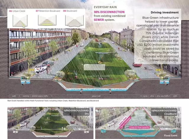 哥本哈根暴雨管理模式提供了一个将建筑、现有背景与蓝绿色改造方案结合起来的结构。可实施、实用的工具可以减少极端暴雨事件,改善我们的城市风景。私人开发商和房主成为当地方案的拥护者,其中跨学科、跨部门的合作包括设计师、规划师、社会学家、经济学家、生物学家、地理学家、信息专家和通信专家,并与公共事业公司、利益相关者、利益集团、当地政治家和投资者互动。