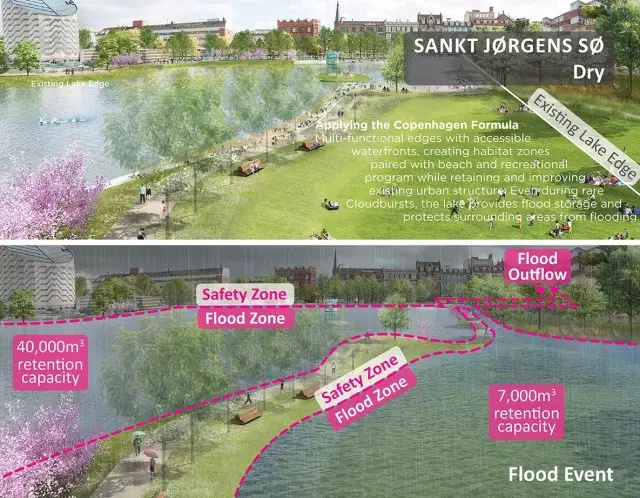 两个总体规划方案上的变化用来评估潜在的优点和缺点——选项1传统,选项2蓝绿色。纵横交错的城市人造障碍(如街道、人行道、建筑物、或铁轨)和最小的等级差异——防止洪水大量排向哥本哈根主要港口进入大海,两个选择之间的关键区别在于对Sankt Jørgens湖的发展策略。