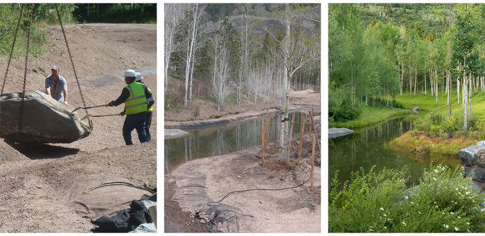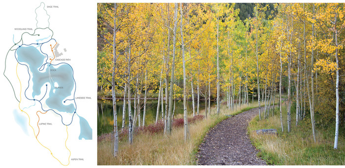 沙石运作项目的视觉残留——暴露在外的路堤和贫瘠荒地——需要增强土壤能力、修复等高线和本土植被。为了营造受损和受保护土地之间的无缝过渡,景观设计师辨别邻近地产现存的排水类型和植物区,然后进行延伸、修复或重建。这个策略在修复本土植物区和加强野生栖息地上很成功。如今,冷杉和云杉廊道、现有排水方式的加入为山地和湖泊之间提供了一个受保护的连接,供长耳鹿、麋鹿甚至是偶然出现的美洲狮活动。