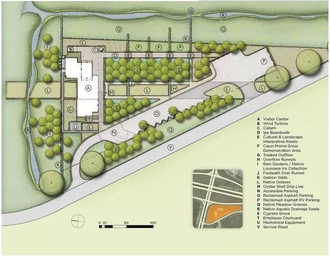 该设计团队是由景观设计师和建筑师组成,运用综合性设计方法和可持续性发展原则设计,保护区域生态和文化。这些成为该设计方案的指导原则,是2008年圣兰德堂区游客和旅游局举办的一个设计竞赛的获胜作品。这个新游客中心位于阿卡迪亚区北部边缘49号州际公路沿线,特色是阐释性本土景观、雨水花园、展览空间、卫生间以及带有展览的户外聚集区/活动区,解释这个独特区域的景观、生态与历史。