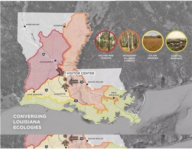 圣兰德堂区是路易斯安那州阿卡迪亚区的北方门户。在49号州际公路建造一个新游客中心的方案会让游客有机会看到森林、湿地和草原等多样化的景观。通过圣兰德堂区新游客中心对本土景观的阐释,游客能更好地了解该区域的特色。