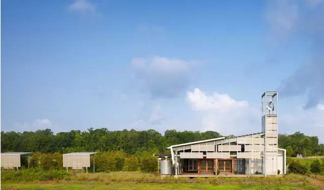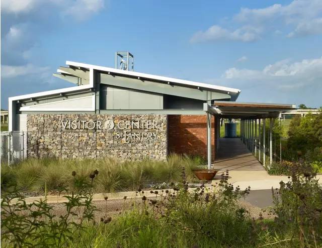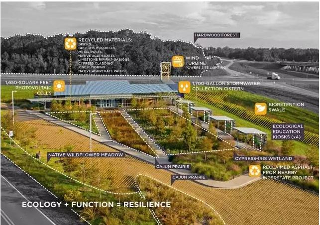 在像阿卡迪亚(景观突出)这样的乡村区域,该设计将建筑与景观完全融合,再由可视化的可持续方法连接起来。建筑师和景观设计师在景观和建筑融合区通力合作,优先考虑景观和户外体验。传统路易斯安那州建筑设置高深的拱廊、抬升高度(谨防雨水浸泡)、倾斜的屋顶和雨水收集系统,还带有现代化的竖轴风车、屋顶上安装太阳能电池板。最突出的是精心选择的本土建筑材料,包括回收砖、本土骨料、碎石沥青、回收的金属以及拯救回来的长叶松和柏树。游客中心展示出新旧可持续实践和恰当的材料如何结合用于一个现代化的区域设计中。