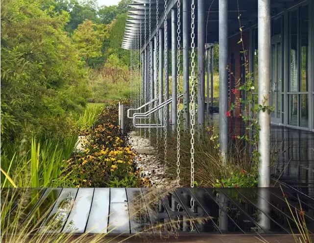 由于圣兰德堂区每年的降雨量在152厘米—177厘米(60-70英寸),力争管理雨水径流。雨水花园通过地面湿地和雨水链收集所有的现场雨水和屋顶雨水,它们会让过多的雨水经过沟槽进入到牡蛎状渠道中。花园由落羽松和8种路易斯安那州本土鸢尾属植物点缀。这些绿荫既美观又具有功能。这些景观是这个设计的焦点,框架出展厅,同时成为邻近停车场和蓄水池过多雨水的生态过滤器。
