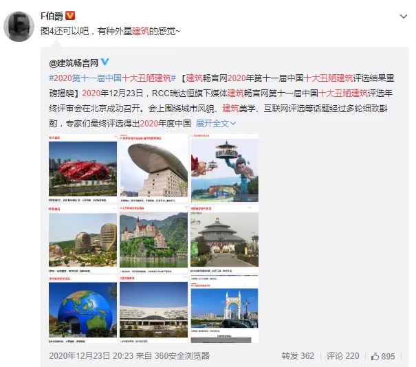 本次评选将全网征集候选项目,微信公众号、抖音、微博——动员全国网友的力量,360度、无死角...,让丑陋建筑无所遁形。