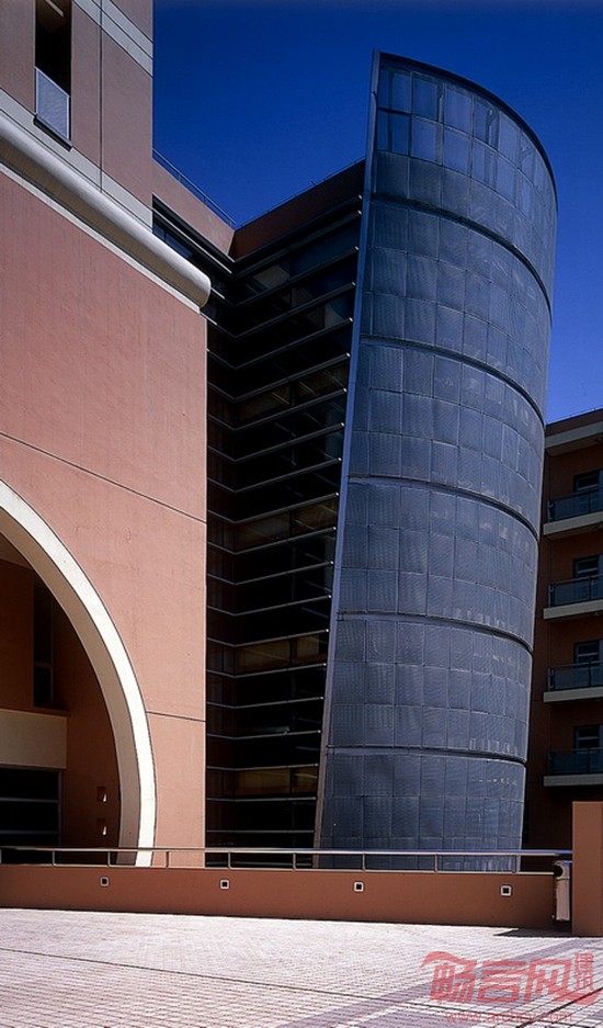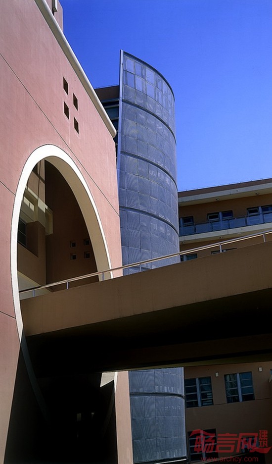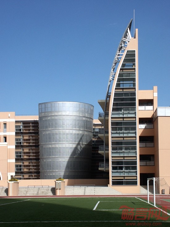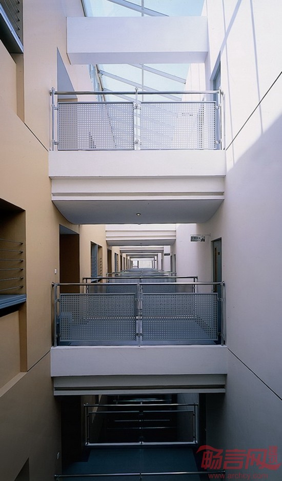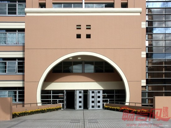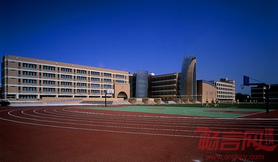 宿舍楼半隐在体育馆的后面,形成相对安静的生活区。“U”的平面布局,其间形成半开敞的庭院,成为师生课余时间的休息场所。