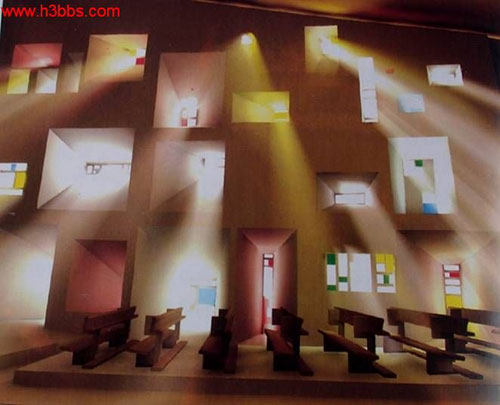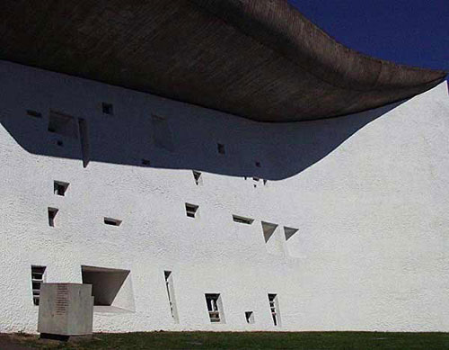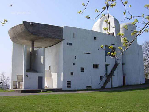这是一座建于1955年,位于群山之中的小小天主教堂,整体建筑位于沃吉(Vosges)布雷蒙(Bourlemont)山頂一处空地上,四周有葱茏茂密的树,如朝拜似的环绕着。视点景观可环顾四周,直达整个南方山脉,空旷宜人。而朗香教堂(Ron- champ)有如一座雕塑品,吸引着人们的视点。水泥喷浆刷白色漆的墙面顶着灰色清水混凝土曲面屋顶,以及三座采光塔楼,形成在色彩上与形式上极为强烈的对比。为了满足多达一万两千人以上的仪式,Le Corbusier引领人们来到上帝的花园---自然,倾听上帝的声音,从而将內部空间的功能移到外部空间。它突破了几千年来天主教堂的所有形制,超常变形,怪诞神秘,如岩石般稳重地站立在群山环绕的一处被视为圣地的山丘之上。朗香教堂建成之时,即获得世界建筑界的广泛赞誉。它表现了勒氏后期对建筑艺术的独特理解、娴熟的驾驭体形的技艺和对光的处理能力。无论人们赞赏与否,都得承认Le Corbusier的非凡艺术想象力和创造力。