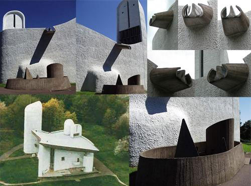 在空间中,萨伏依别墅极为重视控制线与法线,在Ron champ是看不到的。相反的,是那些弯曲弧线加以建构组合。