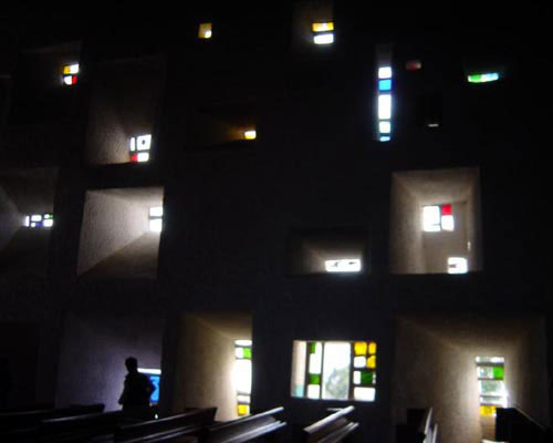 勒·柯布西耶当初接受这个重建朗香教堂的工程时,采用了一种雕塑化而且奇特的设计方案。Le Corbusier有意的将教堂隐喻为"声学器件",藉由声音,联系信徒与上帝之间的距离,达成沟通的渠道。他突破了历来的天主教堂惯用的模式,用一个曲率复杂的黑色屋顶覆盖在弯曲的墙面上,由于它的曲面卷曲向上,于是好像是飘浮在墙面上一样。南面的墙被称之为“光墙”,这个墙体很厚,上面留有一些不规则的空洞,室外开口小,而室内开口大,比例奇特,靠外墙的部分装上教堂里常用的彩色玻璃。Ron champ的南面窗孔的开设法,据说为勒氏1931年在北非所见摩札比建筑所引发的灵感;设计上由外而内逐渐扩大,形成深凹的八字形,使得由外界引进的光线在室内发散开来,光线进入室内时,经由厚牆的"过滤器",让光的表情变的柔和、自然。同时,墙体和屋顶的连接并不是无缝的,而是有一定间隙的,她的三个弧形塔把屋顶的自然光引入室内,这些做法使室内产生非常奇特的光线效果,从而产生了一种神秘感。主礼拜堂位于东面,这是符合基督教义的。这个礼拜堂可以容纳50个人。
