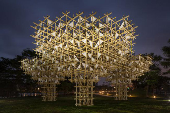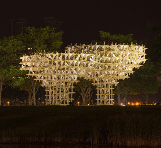 所选的展馆名为“三胞树”(Treeplets),此为一个临时的竹制结构,试图解决公民和城市景观之间的规则问题。设计师认为,城市密度并不意味着生活在一个混凝土构成的冷酷的环境中。他们深信,需要教育、宣传和培养激发城市风格的其他形式,以此在公共空间的自身特点内发挥可能的作用。