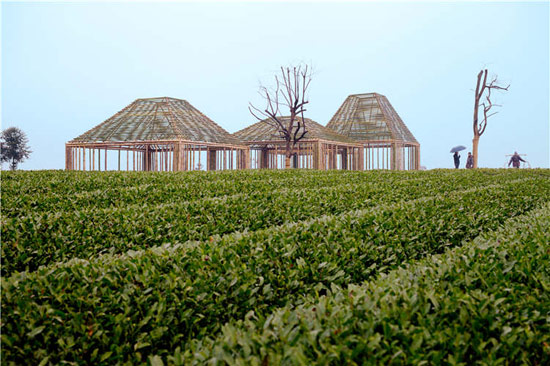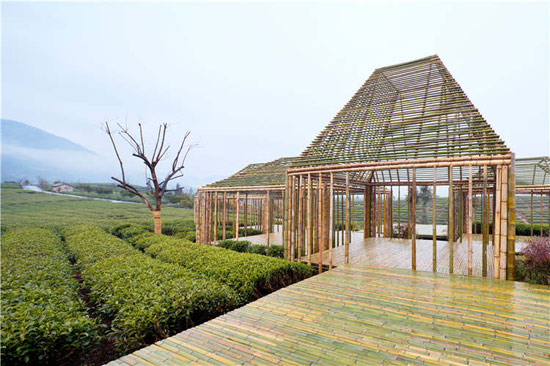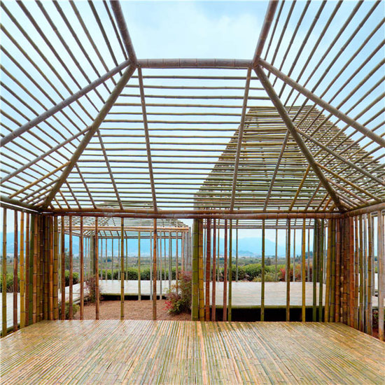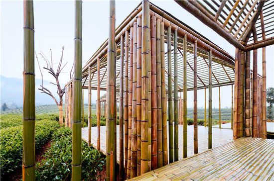 松阳盛产的竹子作为建构材料,可以减少对茶园生态环境的影响,用料环保,结构轻盈简洁,震害轻,施工速度快。结构体系采用直径100~120mm的毛竹。四角脊线竹龙骨加上顶部口字形结构单元形成的基本屋面结构,辅以四坡面顺坡面次竹龙骨形成大大小小稳定的三角形单元,共同组成一个稳定大跨越空间屋面体系 ;墙身系统由竖向布置的柱龙骨组成,其布置四角到中间由密至疏的渐变既反映了受力变化趋势,也节约了用材。