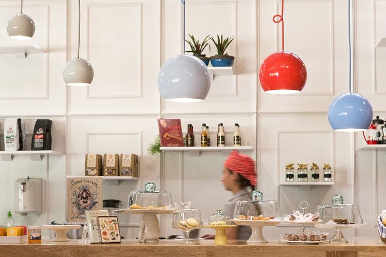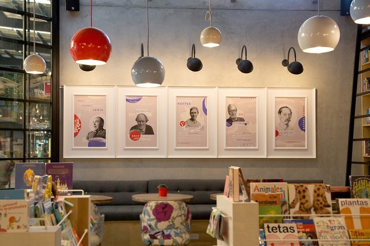 在店内四处可见圆滚滚的可爱吊灯,墙壁上也挂满富有趣味的海报。书架很贴心地分成两大类,一般高大附梯子的书架摆放的是一般书籍,而像是娃娃床的矮书架则专门摆放童书,让孩子们想拿书时不会遇到任何困难。隔墙中被挖出了数个六角形的休息空间,让玩累的孩子可以有地方休息,甚至父母还可以在这里为孩子讲床边故事。咖啡厅则採用简洁明快的色调,后方是一整面白色牆面,而木头吧台桌上摆满了美味的点心。