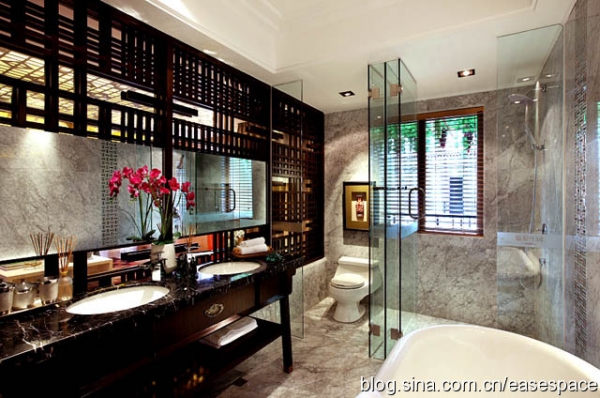使用物料:中花白大理石、黑檀木、真丝墙纸、橡木仿古地板