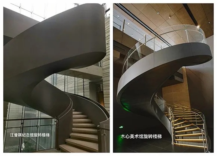 两个场馆均以蛇形旋转式楼梯连接上下层,展墙则采用清水混凝土材质,并在一侧墙面设有黑白简约风格的大幅画框来展现纪念作家。