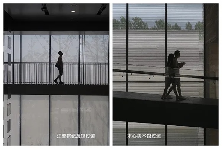 在供读者阅览作家作品的图书馆中,两个场馆均采用阶梯式设计,让一旁的藏书区与阶梯紧密相连,并利用书架与展板的交错搭配使整个空间看起来错落有致。另外,汪曾祺纪念馆室内多处玻璃天顶、过道和走廊的设计也与木心美术馆十分相仿。